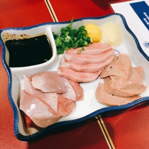 豚のタン、心臓、レバーの刺身盛り合わせです。