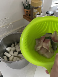 大根は米の研ぎ汁で洗う。